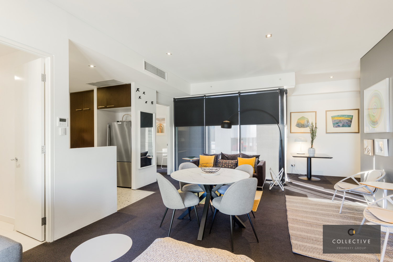This stunning fully furnished and equipped 2 bedroom 2 bathroom apartment is located right in the heart of Perth. The architecturally designed apartment boasts a 118sqm floor plan with grand entrance hall, good size balcony, spacious living area and kitchen with polished concrete flooring, stainless steel benchtops, 90cm oven and large gas cooktop.Each of the bedrooms are a spacious double with built in wardrobes and stunning city views. All of the furnishings are brand new and include everything you need so you can simply move in with your suitcase.