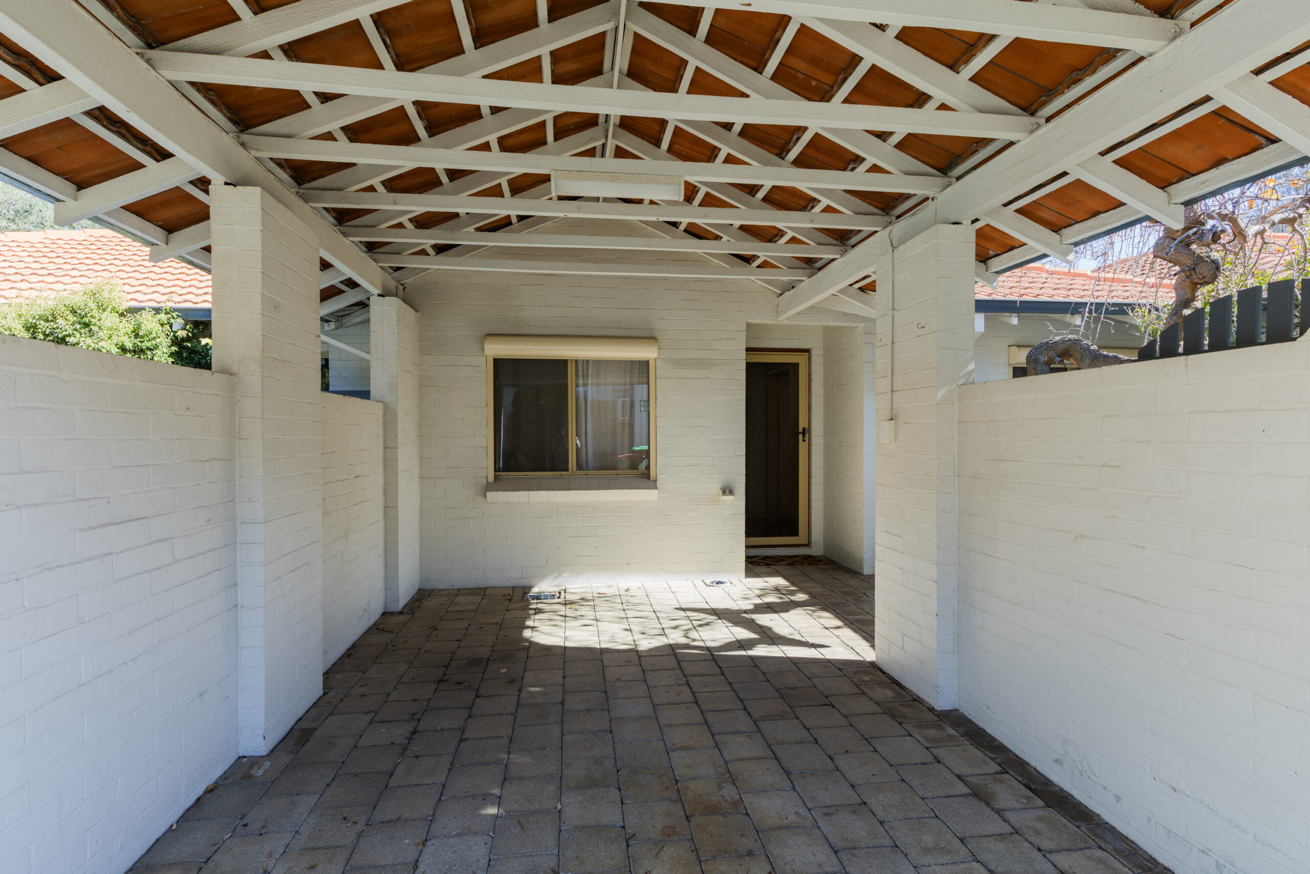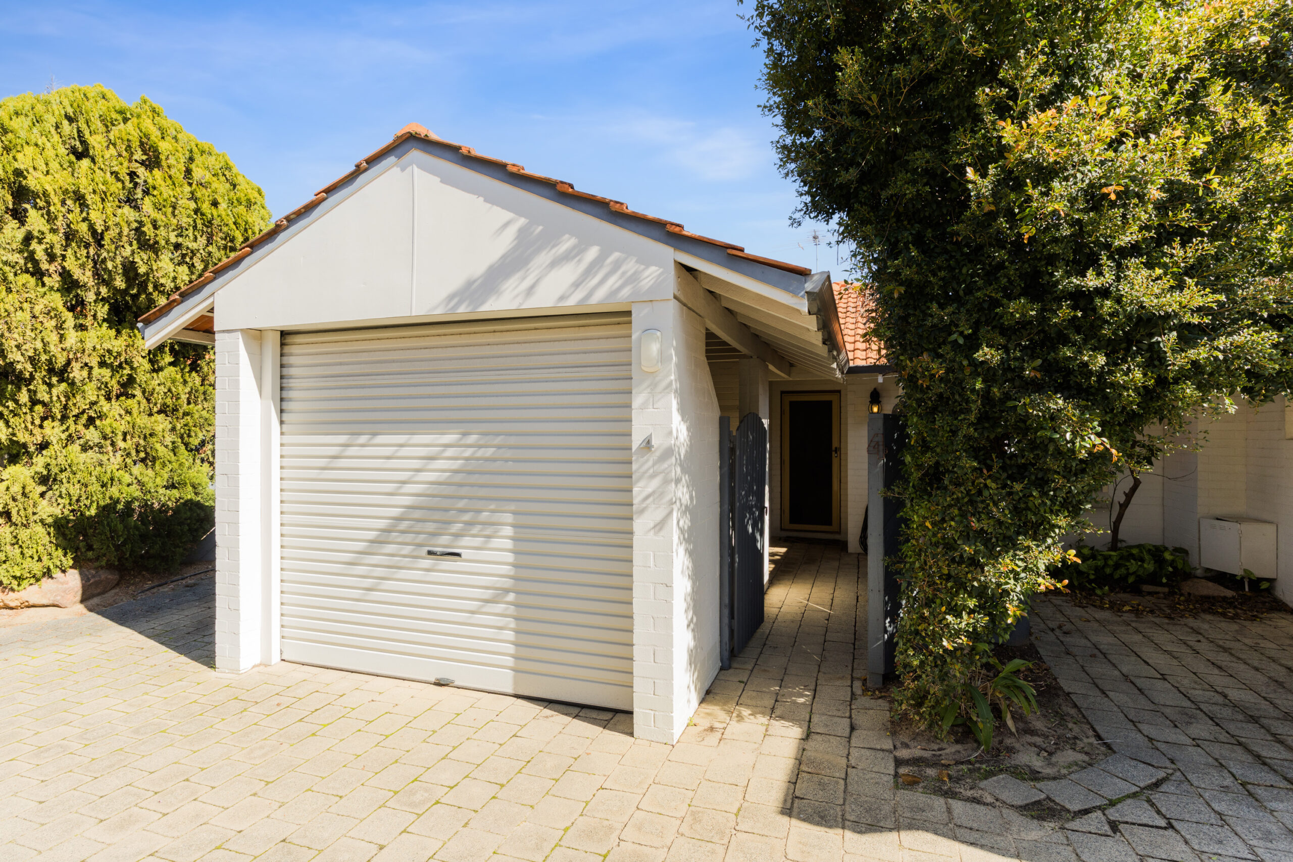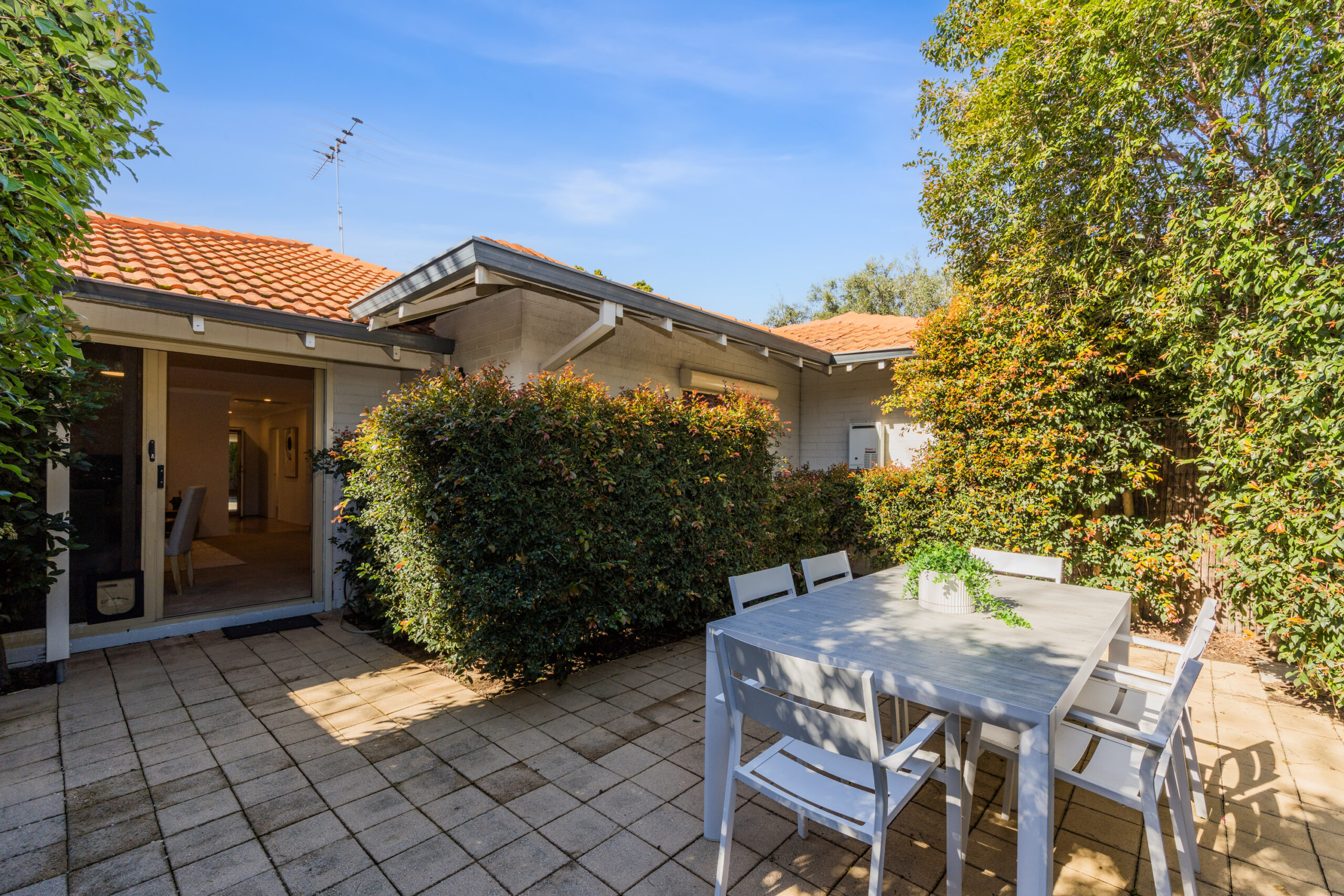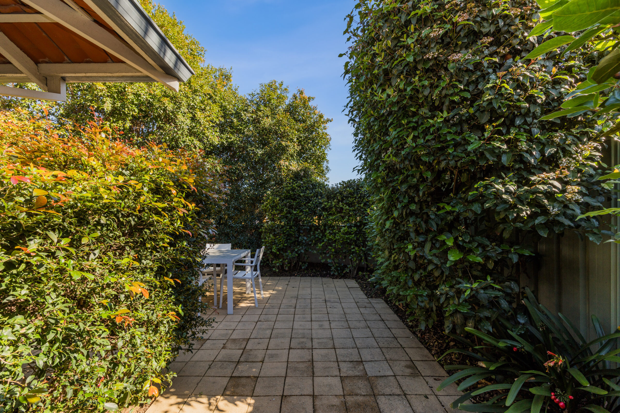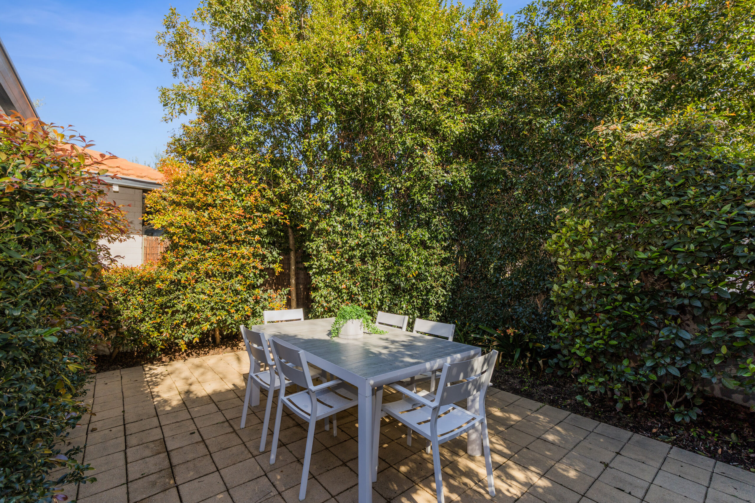 -Paved courtyard with established, reticulated gardens